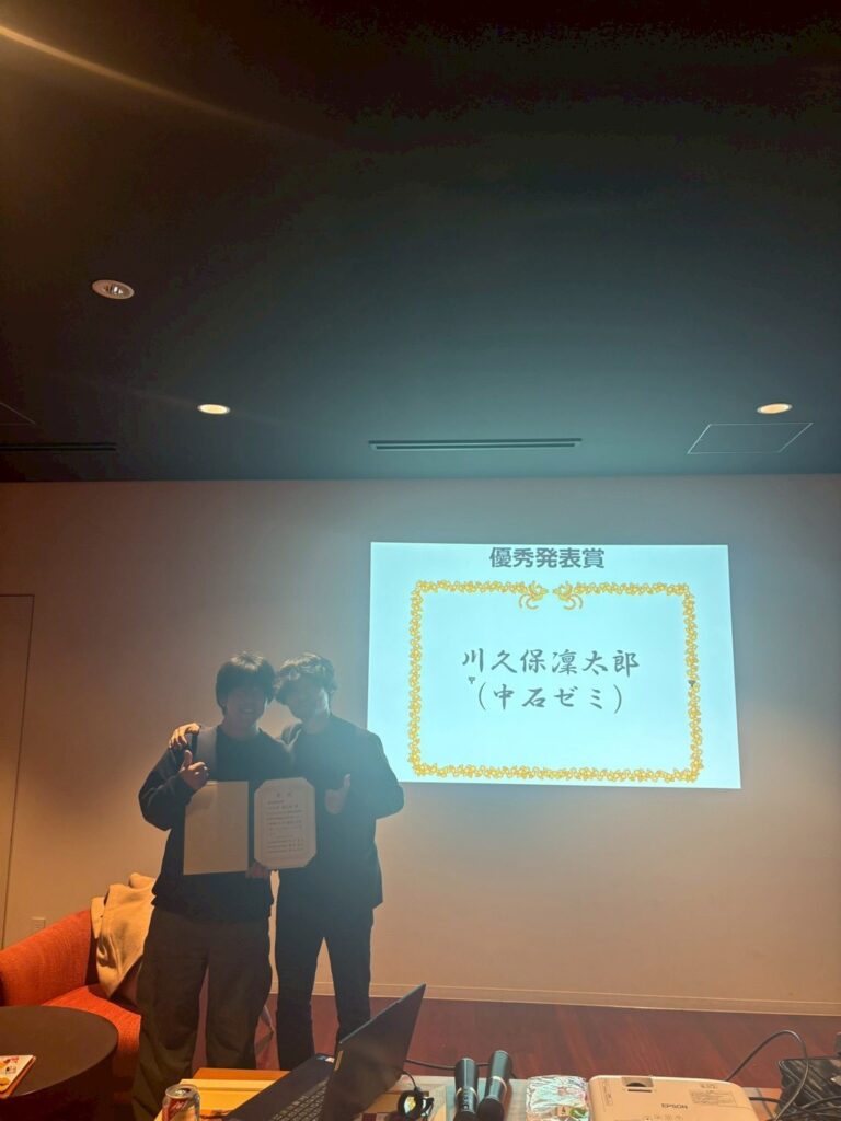 ※加河ゼミ4年の井上海璃くん、藤井ゼミ4年の有村拓くん、藤井ゼミ3年の髙村碧さんにはベスト質問賞が授与されました。